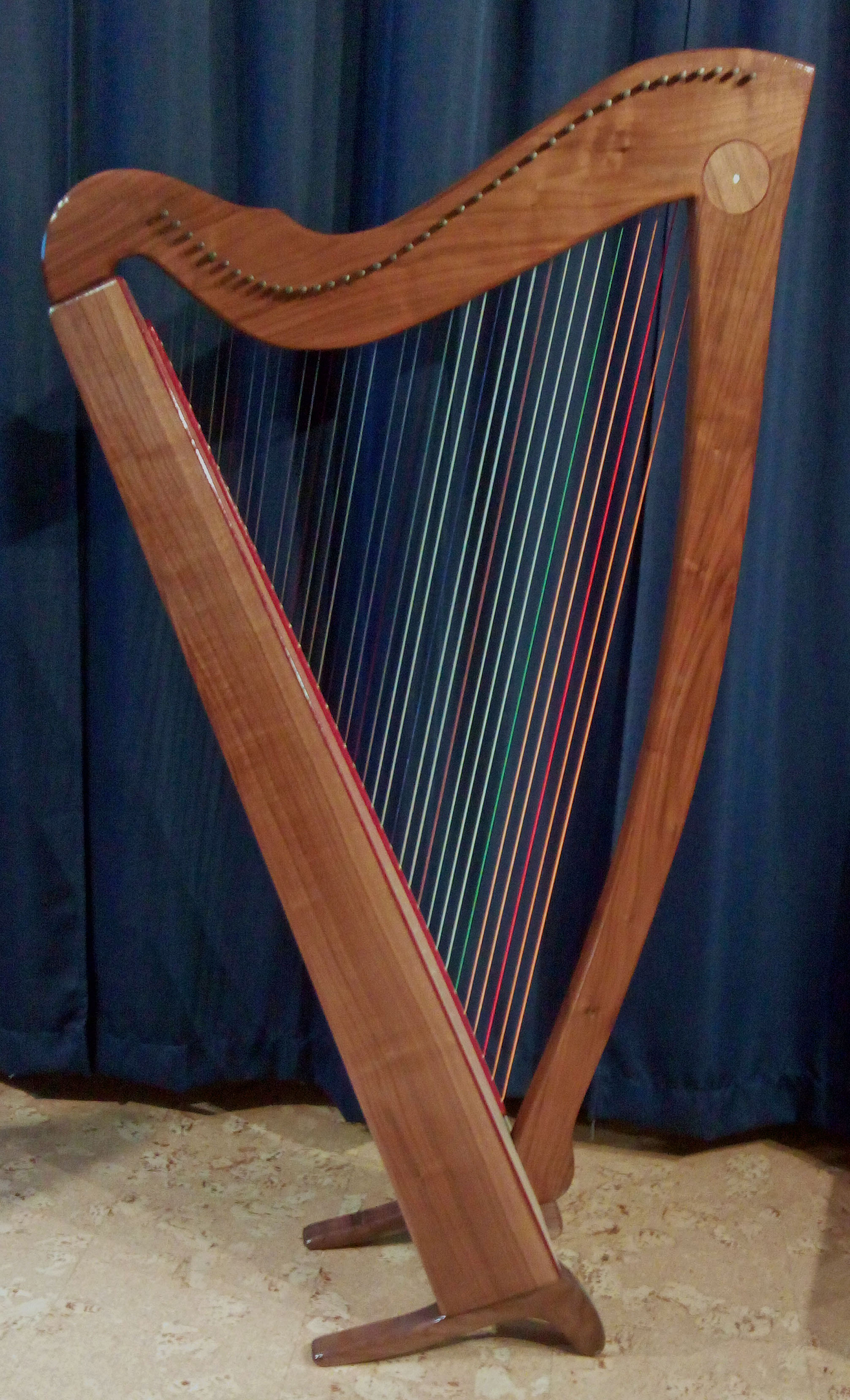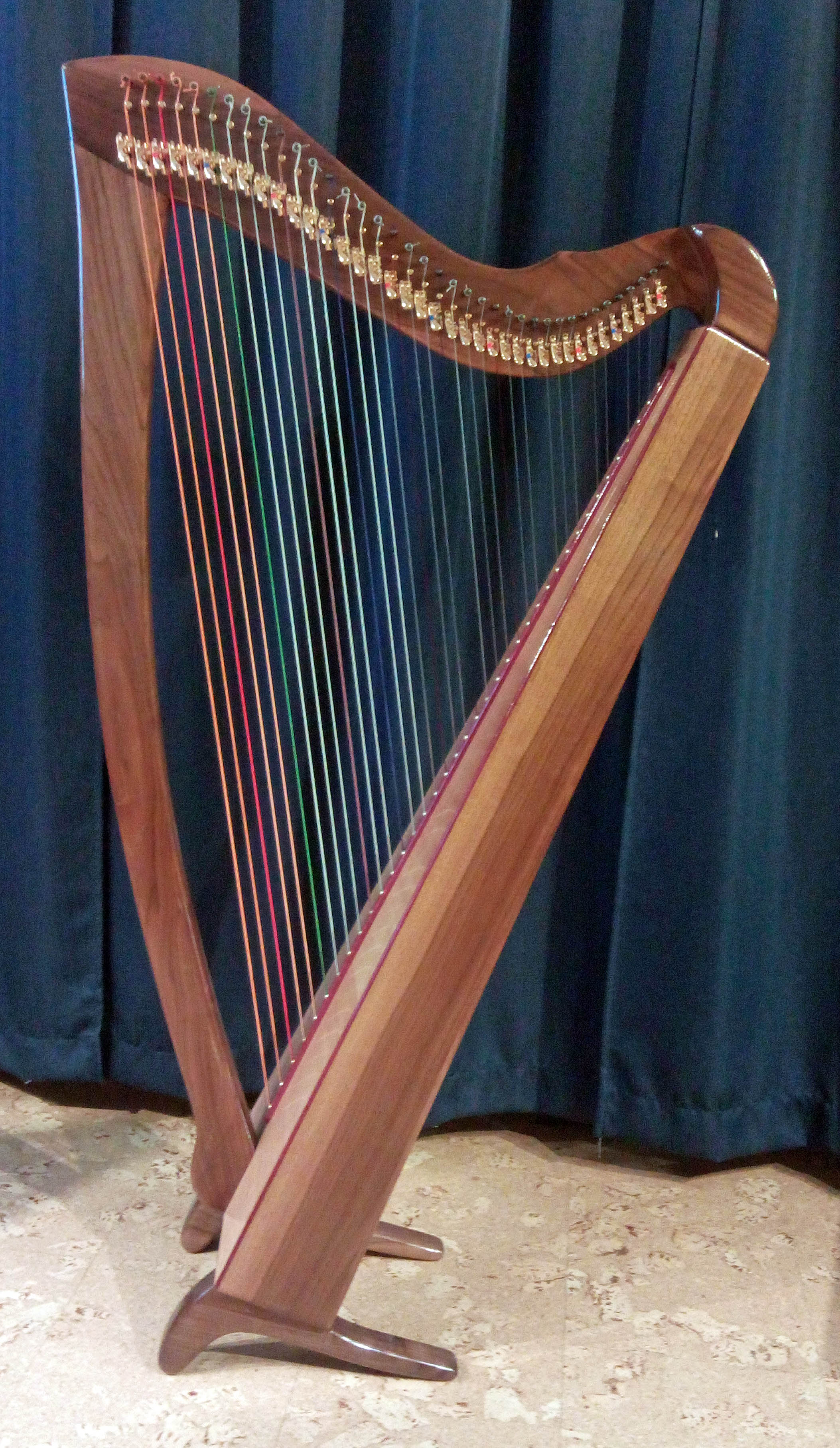 The 38 String Dayspring Harp was designed for professionals and enthusiasts who need a big harp with excellent acoustic tonality and sound projection for performance and recording. It has the same profile as the Wellspring Harp but is 1/3 larger with a 20% increase in string tension. Sides are staved by 10 degrees. It has Purple Heart rib inlays on the soundboard and the string bar as seen in the pictures. Sound board is made of solid Sitka spruce. The Dayspring has a simple but robust presence that gives confidence and power. It is available in Western maple, Black Walnut, Cherry and comes with a full set of Camac levers.