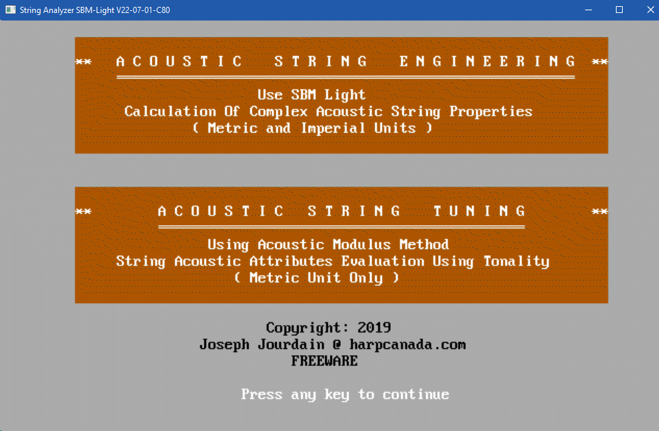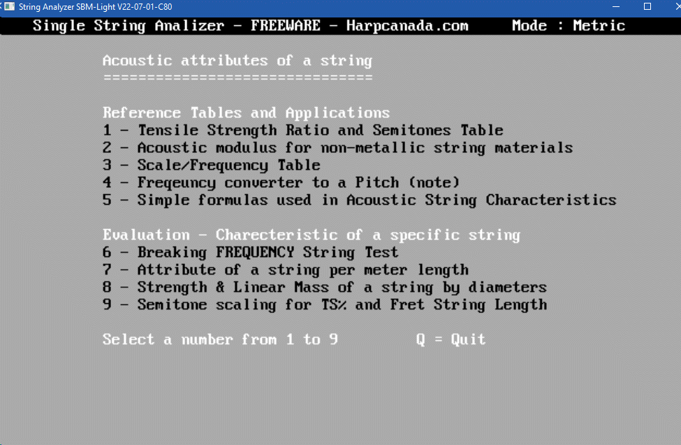 Acoustic Tuning app is a freeware you can download to compute string characteristic for harps and other stringed instruments. . It is compiled (using QB64) for running in Windows 64 bit. It is a calculator that does core string characteristics for single strings (one at a time). Only the metric unit system is used in this app. Results can only be saved to the clipboard as a screen shot. Below are three screen shots showing the opening screen, the calculation logarithms available, and one of the report displays from selection 9 on the menu. This one demonstrates the principles of the Acoustic Strength based on the Acoustic Modulus of a string as explored in the Stringing Inquiry page.