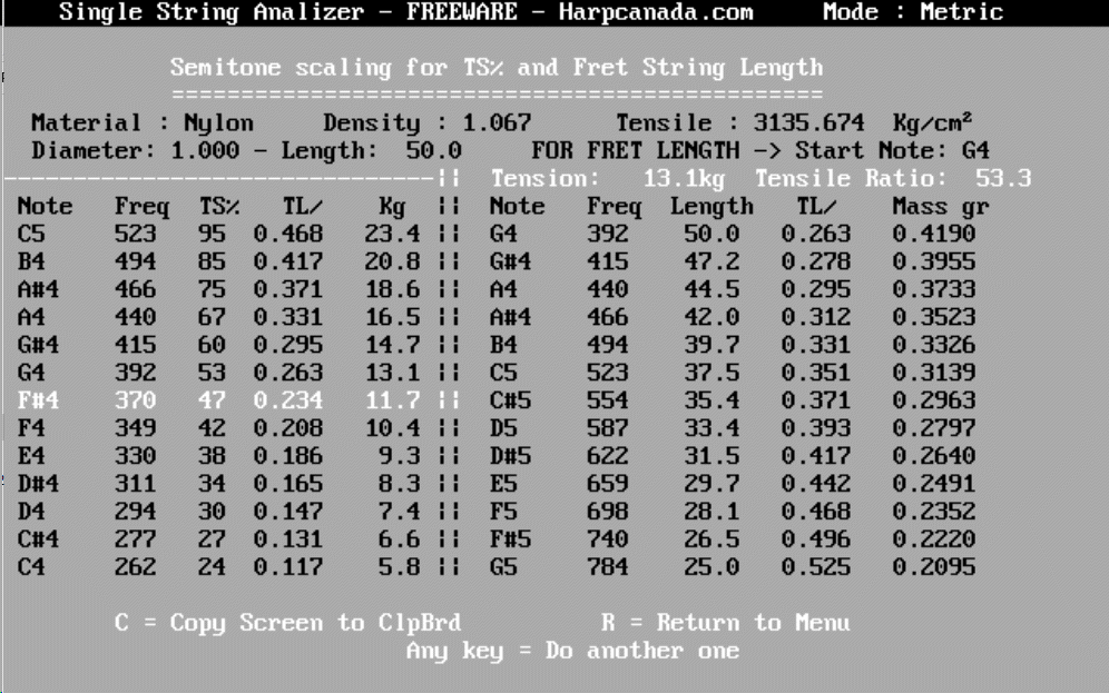 The data on that screen tells you the highest note the string will make before it breaks, that is C5, with a tension at 23.4 Kg. As you lower the pitch by semitones the tension is reduced accordingly with a lower tensile strength ratio. At around 6 semitones lower than C5 the tensile strength ratio is around 50% and for that string, the tension is at about 12Kg. On the right side of the screen we see a fret length (string length) when the open string is tuned at G4 with at tensile strength ratio of about 53%. You can play with those variables and see how by changing string length, core diameter and note of the open string, you will affect the tonality of the string, all on one screen. This is at the core of string scalling and tonality for any instrument with a specific tuned resonator (sound board).
