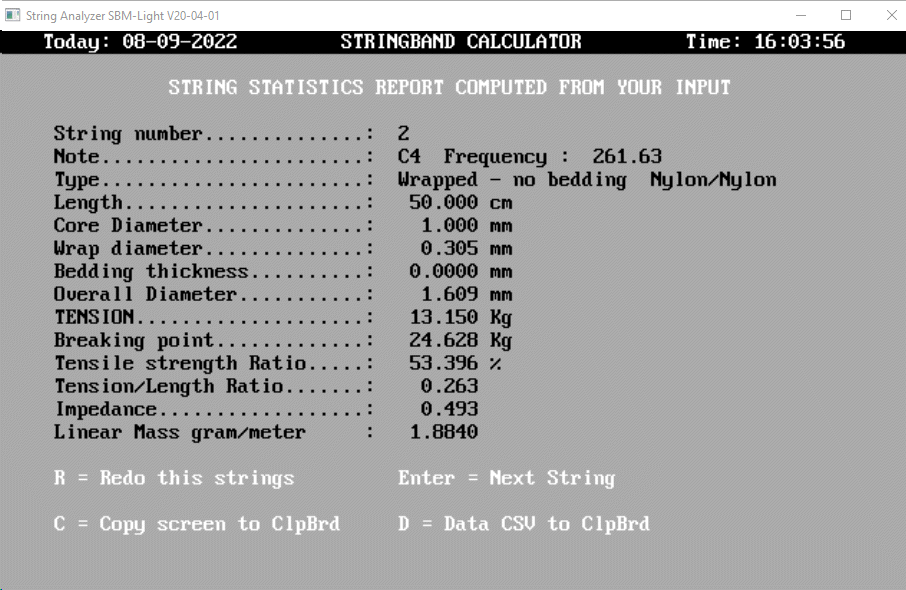 You can use the data on that screen to work out composite strings. Let us say you want to tune the above string to C4. The tension and the tensile strength ratio are too low for the strings to resonate. The string needs to be heavier so we can had a wrap to it, but how big should the wrap be? Now you can use SBM-light to do a wrap string calculation for the data you just got. Choose item 5 (find the wrap diameter of a wrapped string without bedding) on SBM-Light calculation menu and it calculates the wrap size you need from the tensile ratio I wanted (about 53% ) which is on the note G4 with a tension of about 13Kg and a T/L ratio of 0.263. For that calculation your input are core size, string length, note and T/L ratio which you got from the 3rd screen above. The wrap size calculated is 0.3mm. Now that you have the idealized value, you can redo the calculation with the wrap size stock you have access to. This scenario illustrates the flexibility of the Acoustic method for string selection.